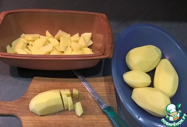 Подготовить форму для запекания с высокими бортами (у меня утятница 24х12х7, количество продуктов подобрано под нее). Можно кисточкой смазать форму растительным маслом. Почистить и порезать картофель небольшими дольками (шайбами, слайсами, кубиками - главное, не очень крупно). Картофель присолить и поперчить (я солю в два слоя, т. к. картошки много), можно посыпать любимыми специями (у меня сегодня обычная приправа для картофеля).
