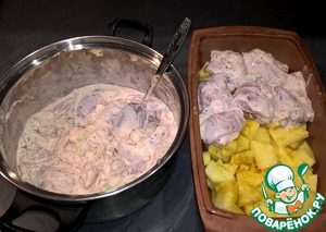 • Замаринованное мясо выложить одним слоем на картофель, оставшийся маринад распределить сверху. В это время желательно включить духовку. В идеале надо выставлять 200 градусов, но моя древняя дает только 170, тем не менее - все пропекается, просто держу подольше.