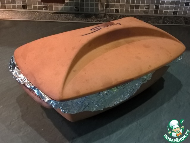 • Поскольку вовремя я фольгой не озаботилась, и остался ее один листик, для верности закрыла и крышкой :) Отправить наше блюдо в духовку на 1 час (я в своей держу час десять - час пятнадцать).