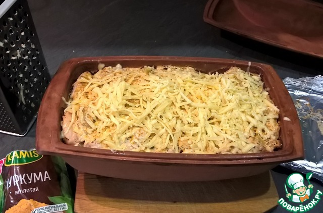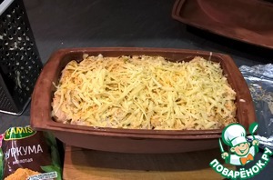 • Час прошел - вытащить форму (духовку не выключаем!), снять крышку и фольгу и вернуть форму в духовку на 15-30 минут для зарумянивания. Можно сверху посыпать куркумой или паприкой для цвета, или посыпать тертым сыром. У меня сегодня и то, и другое.