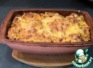 Час прошел - вытащить форму (духовку не выключаем!), снять крышку и фольгу и вернуть форму в духовку на 15-30 минут для зарумянивания. Можно сверху посыпать куркумой или паприкой для цвета, или посыпать тертым сыром. У меня сегодня и то, и другое.
