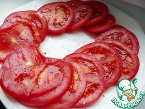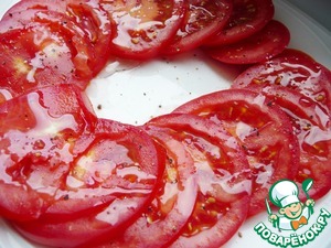 Спелые помидоры нарезать острым ножом токими кружочками. Разложить на тарелке внахлест.