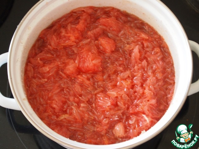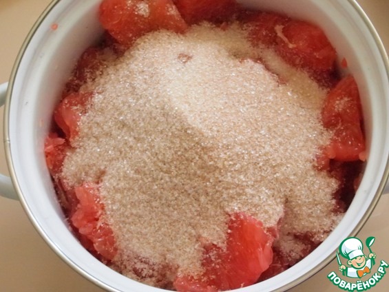 (без желатина в этом случае, кстати, можно обойтись. Надо просто собрать все белые части грейпфрута - шкурки с долек, мякоть с внутренней стороны цедры, - и либо выварить все это дело около часа, вынуть и добавить все остальное, либо завернуть белые части в кусочек льна или марли и варить все вместе, а в конце мешочек вынуть. В шкурках весь пектин, он зажелирует варенье. Варить в этом варианте надо пару часов, только следить, чтобы не темнело)