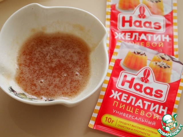 В небольшом количестве горячего выделившегося сока (80-90 градусов) разводим подготовленный желатин так, чтобы он полностью в нем растворился.