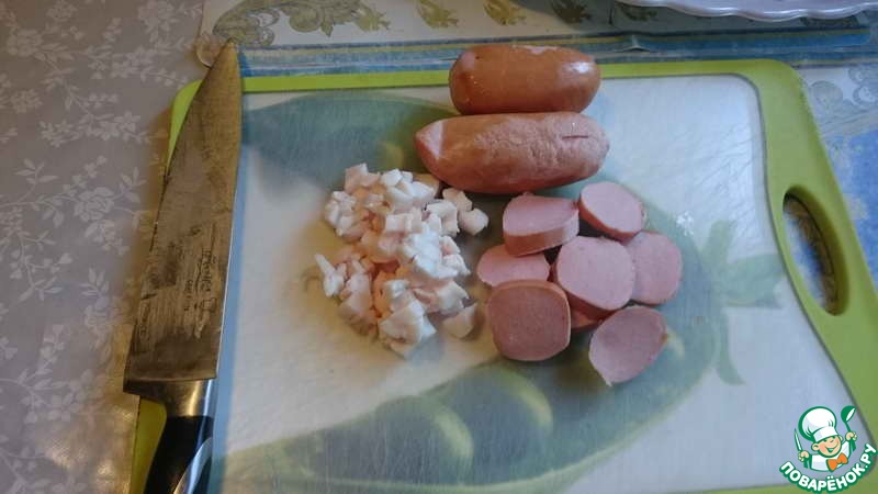 Сало режем мелким кубиком. Сардельки кружочками. Если большие - разрезаем на половинки.