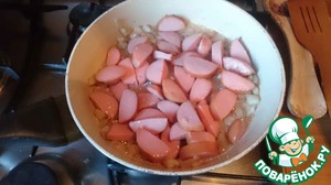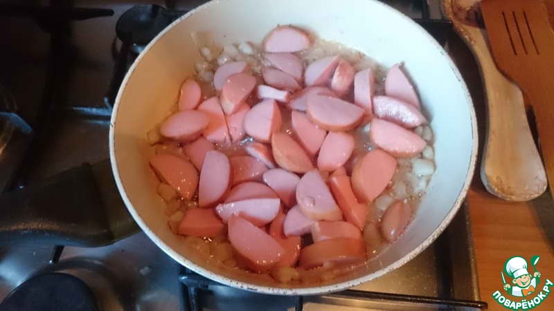 Добавляем сардельки. Немного перца из мельницы. Перемешиваем и чуть прижариваем сардельки.