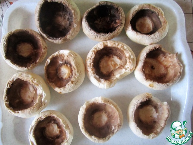 Вымыть шампиньоны, отделить ножки от шляпок ( их можно использовать для другого блюда). Я еще немного поскоблила ложкой внутри шляпок, чтобы убрать губчатую перепонку.