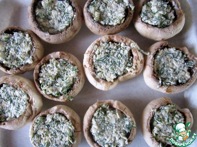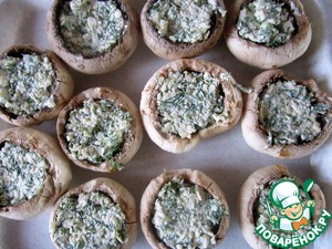 Нафаршировать шляпки грибов и запекать при 170 гр. 15-20 минут