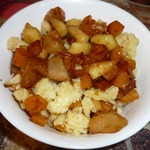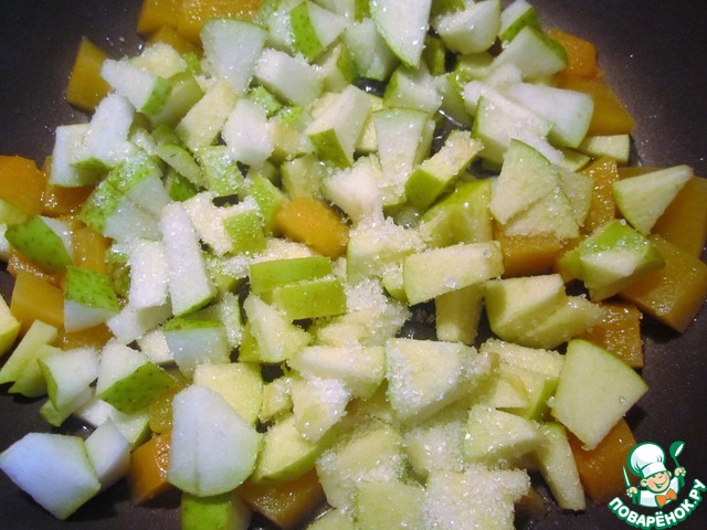И добавить их к тыкве, когда она потушится до полуготовности, посыпать сахаром, перемешать и обжаривать уже без крышки до легкой карамелизации сахара