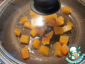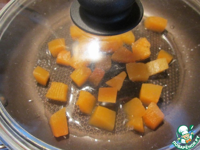 С тыквы срезать кожуру, нарезать кубиками (у меня была замороженная) и тушить под крышкой с растительным маслом и 1-2 ст. л. воды