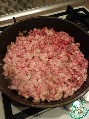 К обжаренному луку добавляем фарш и на максимальном огне жарим-тушим до полуготовности. Снимаем с огня.