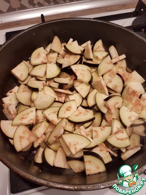 В пустую сковороду с маслом добавляем баклажан. Нарезка тут может быть любая, как Вам больше нравится. В это время нарезаем кабачок.