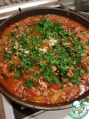 Добавляем наш фарш со всеми его соками, томатную пасту, травы, солим и перчим по вкусу, закрываем крышкой и тушим на небольшом огне около 15-20 минут.