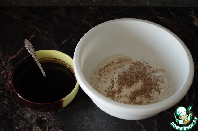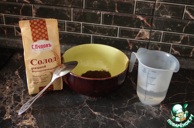 Перед тем, как начинать готовить ингредиенты - лучше для экономии времени поставить кипятить воду - когда подготовите она уже закипит. Первым делом нужно запарить ржаной ферментированный солод. Запаренный солод дает гораздо больше аромата, чем если его добавлять сухим. Для этого насыпаем 4 ст. л (без горки) солода в посуду и заливаем 200 мл кипятка. Нужно хорошо перемешать и продолжить готовить ингредиенты. Я еще для разбавления нагреваю воду до 50 градусов, хотя можно и холодную добавить. У меня электрический чайник с изменяемой температурой нагрева, потому я сначала ставлю на 50 градусов, нагреваю, отливаю стакан воды для разбавки и далее ставлю на кипячение, но это не обязательно.