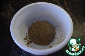 Теперь всё вместе смешиваем до однородной массы. Я сначала смешиваю ложкой, пока получается, затем одной рукой. Вторую чистую руку смачиваю в воде, очищаю первую, обе смачиваю и домешиваю уже двумя руками, периодически смачивая в воде. Здесь есть маленькая хитрость - чашку с солодом не нужно сразу мыть, а набрать в нее воды и в ней смачивать руки. Там еще осталось масло на стенках, потому руки будут не только водой смачиваться, но и маслом - меньше будут прилипать. Ржаное тесто для хлеба очень липкое и по консистенции как глина получается, потому необходимо смачивать руки при замесе. Никакой муки больше не надо добавлять - при указанных пропорциях тесто получается таким, как надо. Делаем из него шарик, накрываем полотенцем и ставим в теплое место на 1,5 часа.