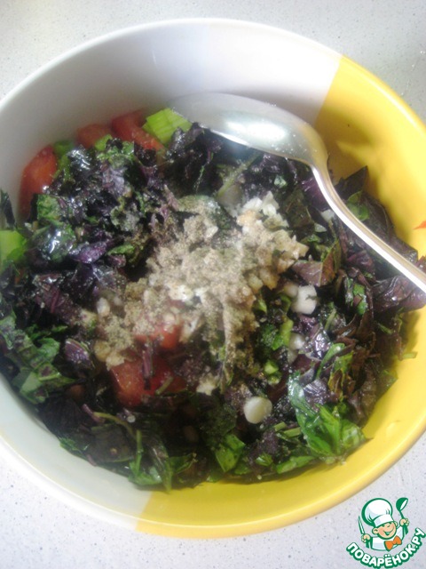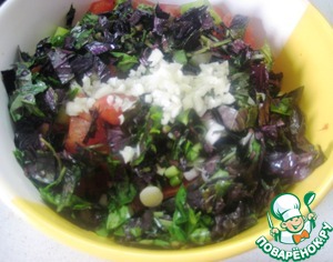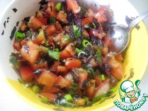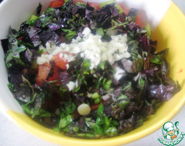Соединить помидоры, зеленый лук, базилик и чеснок в мисочке. -