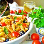 Делюсь еще одним рецептом от моей подружки, проживающей теперь в солнечной Италии! Салат с макаронами в сочетании с ароматной заправкой, похожей на заправку для приготовления брускетты! Получается ароматно, сытно, сочно и по-летнему ярко!