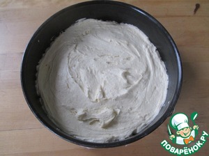Подготовить форму, дно застелить пергаментом, бока смазать слив. маслом. Форму лучше брать разъёмную диаметром 26 см. Поместить тесто ровным слоем в форму.