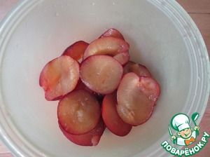 Сливы (250 гр) разрезать пополам и извлечь косточки. У меня сливы были очень большие, поэтому каждую половину я разрезала еще на 2 части вдоль. Но это можно и не делать.