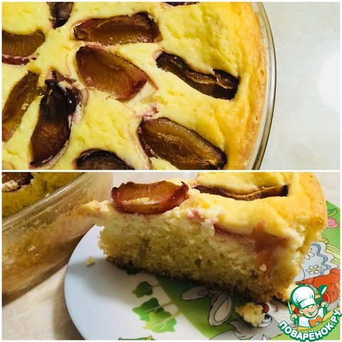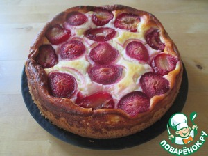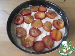 На тесто в форме ровным слоем поместить творожную массу, затем сливы, немного вдавив их. -