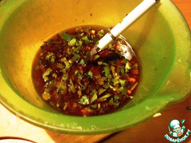 В миске соединить масло, соевый соус, рыбный соус, чили - пасту, сок лимона и сахар. Перемешать. Добавить чеснок и кинзу. Перемешать ещё раз.