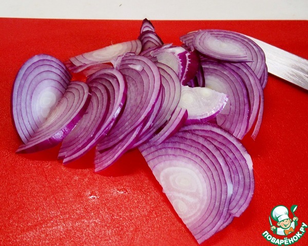 - Лук красный (В оригинале рецепта добавляется только зеленый лук, с добавлением ещё и красного лука вкус мне показался интереснее) — 1 шт
