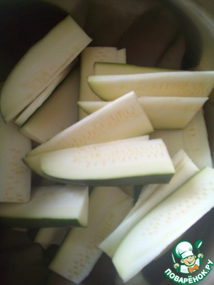 Взять кабачок и порезать ломтиками. Т. к. у меня молодой кабачок с тонкой кожицей и мягкими семечками, я его не чистила, а сразу порезала. Длина ломтиков примерно 10 см, толщина 2-3 см.