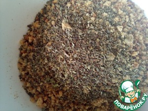 В еще одну тарелку насыпать сухари. У меня были домашние перемолотые сухари. Добавить к ним смесь сухих трав и посолить по вкусу.