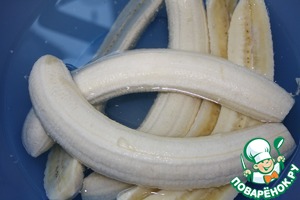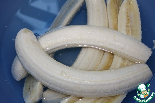 • Бананы очистить и разрезать пополам и обмакнуть в подкисленную холодную воду.