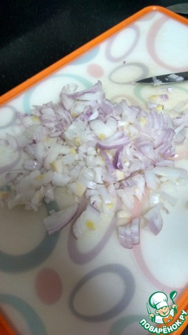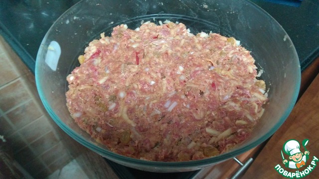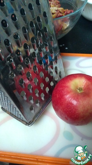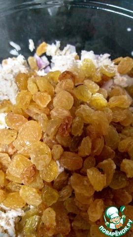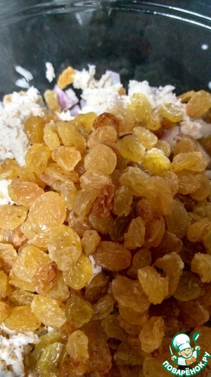 В ту же миску кидаем весь изюм, мелко нарезанную луковицу и тертое яблочко. Изюм можно не замачивать предварительно.