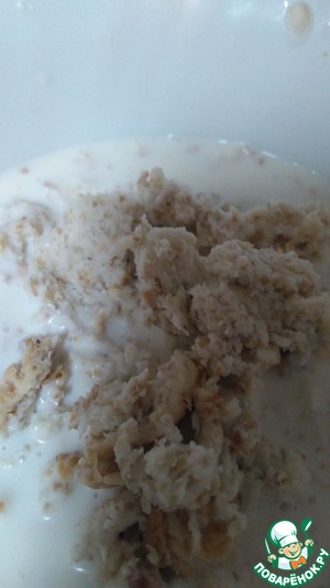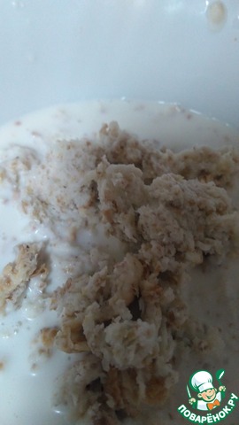 Два ломтика несладкого хлеба крошим, замачиваем в стакане молока или сливок. Затем хлеб отжимаем и туда же, в миску с мясом. Молоко не выливаем!