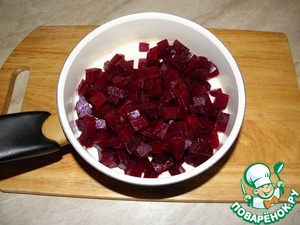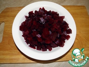 Свеклу отвариваем или запекаем, нарезаем крупным кубиком, можно соломкой или брусочками, как вам нравится (только на терке не измельчайте)