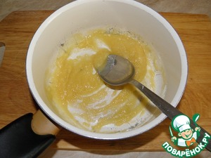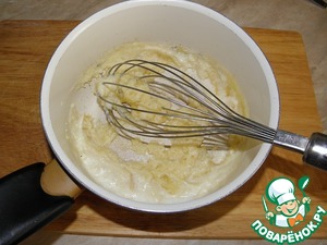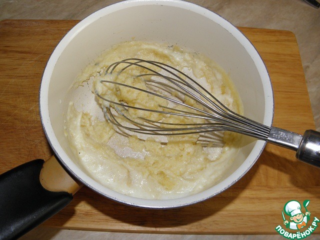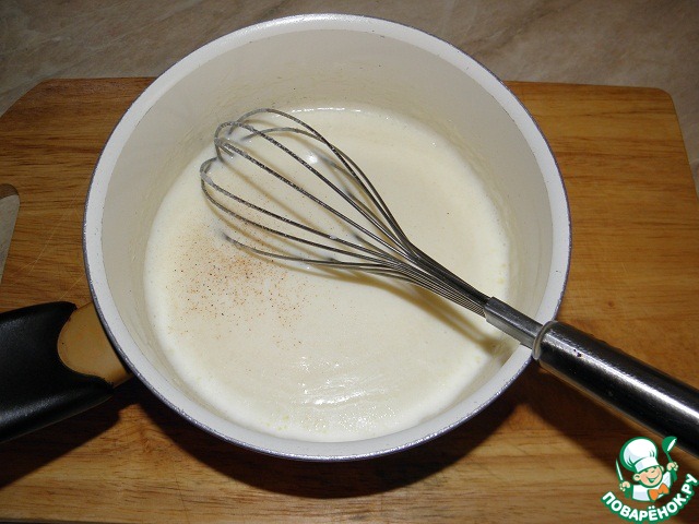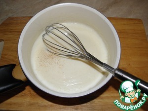 Дальше начинаем добавлять горячее (предварительно доведем его практически до кипения) молоко - буквально по паре столовых ложек. При этом не перестаем мешать, чтобы смесь стала однородной.