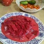 Не снимая кастрюлю с огня (я переставила, чтобы сделать фото), закладываем кубики свеклы.