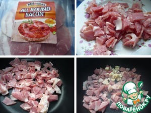 Бекон нарезать небольшими кусочками, слегка обжарить без масла, добавить измельченный чеснок, обжарить до готовности.