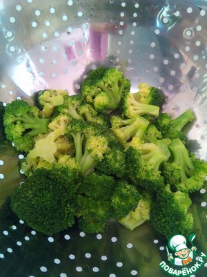 Брокколи помыть, разобрать на соцветия, отварить в кипящей подсоленой воде в течение 2 минут, откинуть на дуршлаг