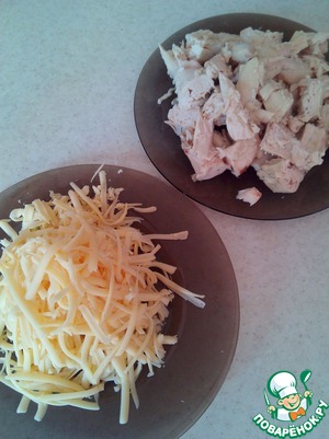 У меня грудка была уже отварена, но можно использовать и сырую, увеличив время запекания, либо предварительно обжарить -