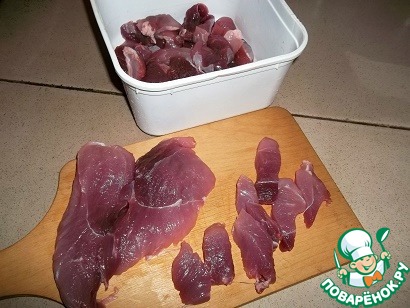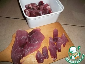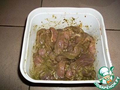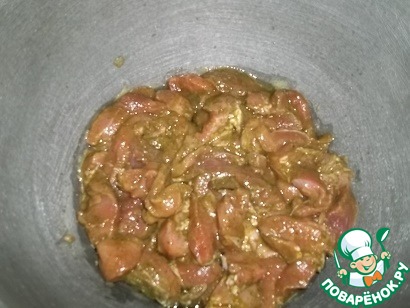 Мясо достать из холодильника, добавить соль, снова "помассировать". В сотейнике или подходящей сковороде (кастрюле) разогреть 1 ст. л. масла, выложить мясо вместе с маринадом, накрыть крышкой. Готовить минут 10-15, почти до испарения жидкости, влить 1,5 стакана воды, продолжать готовить.