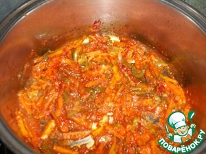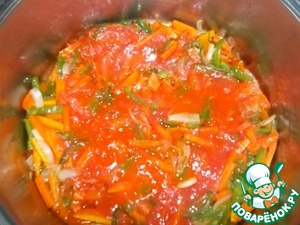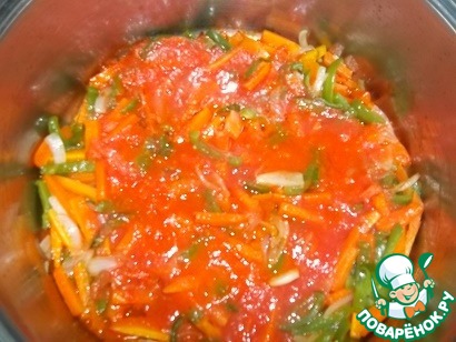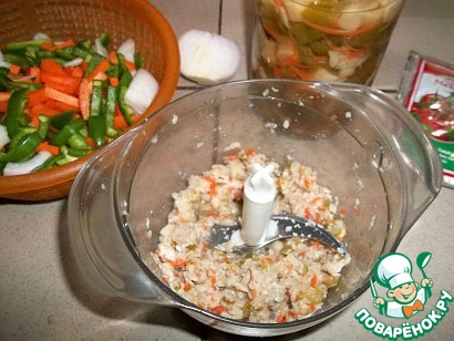 Между тем подготовить ингредиенты для соуса. Морковь нарезать тонкими брусочками, болгарский перец полосками, лук - четвертинками колец. Помидоры пробить в блендере с кусочком имбиря в томатное пюре. С маринованных грибов (у меня грибы типа вешенок маринованные с морковкой, болгарским перцем и сельдереем), слить жидкость, пробить до состояния икры.