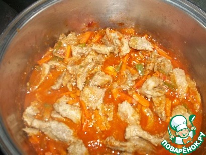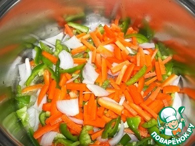 В сотейнике разогреть 3 ст. л. масла, выложить подготовленные овощи (мясо все еще на огне). Жарить, помешивая, минут 10.