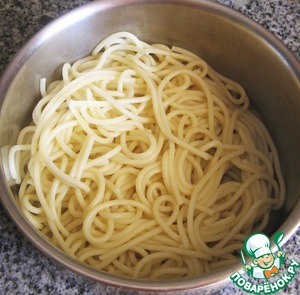 Отварить спагетти в достаточном количестве подсоленной воды согласно указаниям на упаковке.