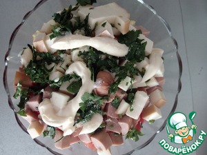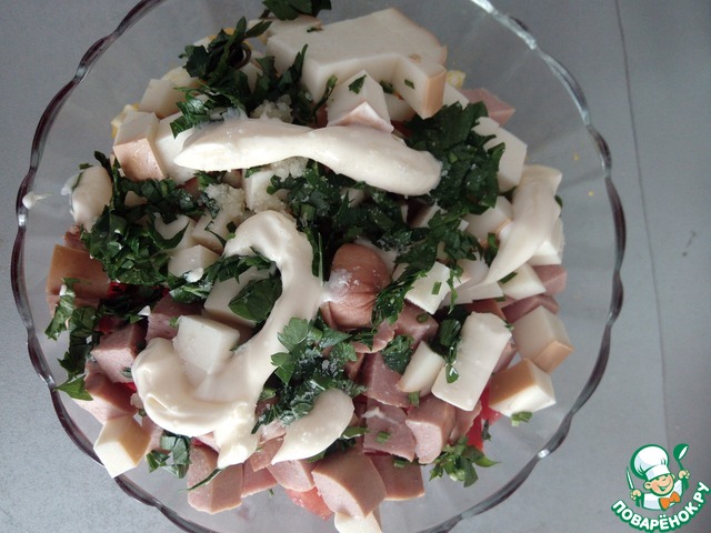 • Сыр и сосиски таким же крупным кубиком, чеснок пропускаем через чеснокодавку, зелень петрушки мелко рубим. Солим по вкусу и заправляем майонезом. Перемешиваем и подаем.