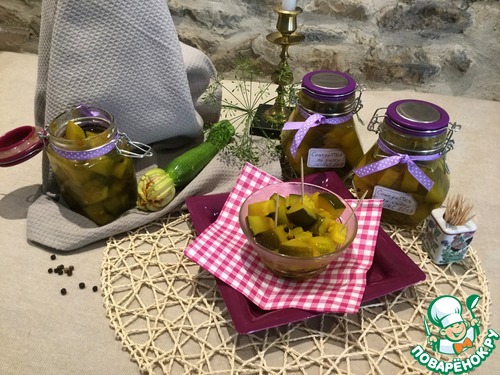Недавно были на дне рождения у соседей, очень понравились на аперитив маринованные кабачки с приправой карри, напоминающие грибы. Cегодня завершилось 4-х дневное маринование и закрытие баночек на зиму. Очень удобна тара на 300 грамм, когда нужно, открыть на закуску, да и в гости в подарок взять можно. Хотя и маринуется 4 дня, каждый день по 10мин. не трудно посвятить этому рецепту. Из 3 кг. кабачков получится 10 баночек по 300 грамм.