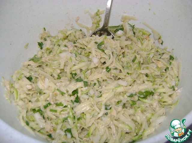 Натереть на крупной тёрке кабачок, картошку. Лук меленько нарезать, зелень измельчить.