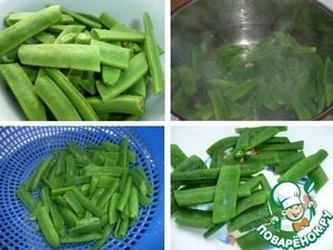 • Стручковую фасоль помыть, нарезать на несколько частей, отварить в подсоленой воде до мягкого состояния, около 5-7 минут. Переложить в ледяную воду на 4-5 минут. Затем откинуть фасоль на дуршлаг.