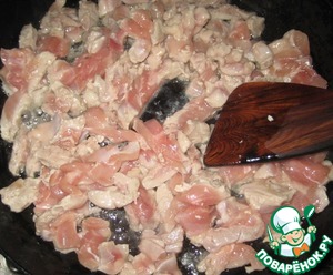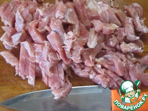 Куриное мясо нарезать, нам нравится длинненькими кусочками.