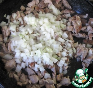 Как только курица начнет золотиться, добавить мелко нарезанный лук. Обжаривать всё вместе 2-3 минуты.