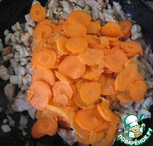 Морковь тонко нарезать кружочками. Добавить в сковороду к курице. Перемешать, обжаривать всё вместе еще минуты 3-4.