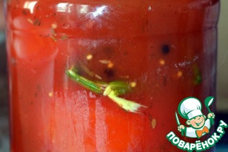 Сложить в банку вымытые яблоки, помидоры, перцы ( можно целиком ), гроздья рябины, соцветия сушеного укропа.