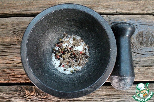 Соль, перец и зиру перетираем в ступке.